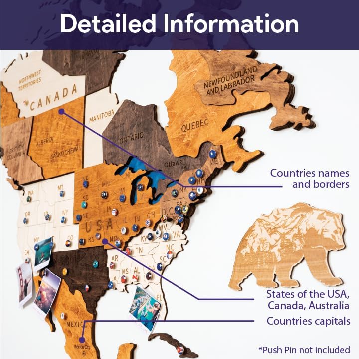 - CHOOSE YOUR PERFECT TRAVEL MAP OF THE WORLD: our large 3d world map for wall has different sizes, let you measure the length and width of your wall, then choose the size which fits your wall. All of sizes have similar details with engraved border, country names, capital names and states of USA, Canada, Australia. In addition, accessories include push pins, decorative wood animal and planes.
