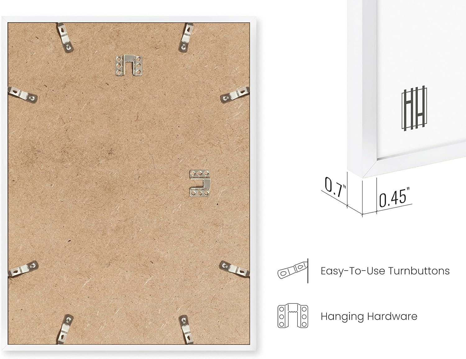 - PICTURE FRAMES WHITE: In addition to its sleek design, this gallery wall frame set is highly functional. The lightweight aluminum construction of the 11 x 14 picture frame makes it easy to hang, and its slim profile doesn't distract from the piece's main focus. This white poster frame is a practical choice for those who appreciate clean, modern design and want to showcase artwork or photographs in a functional and visually appealing way
