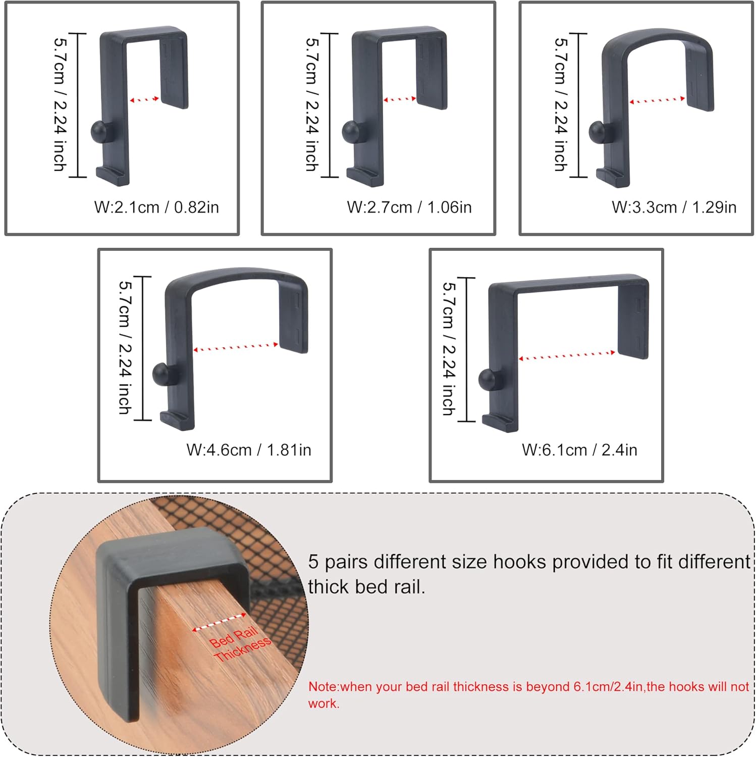 - Durable & Roomy Storage Basket : The basket is made of reinforced and high density iron wire mesh around with well welded strong iron wire,surface finished with glossy painting.Basket appro size:10.43"x4.72"x3.62"(LxWxH).5 pairs different size plastic hooks offered to fit different thick bed rails,Thickness of bed rail the hooks can fitted are:2.1cm/0.82",2.7cm/1.06",3.3cm/1.29",4.6cm/1.81",6.1cm/2.4".(Note:If the thickness of your bed rail is beyond 6.1cm/2.4",all the hooks won't work for it)