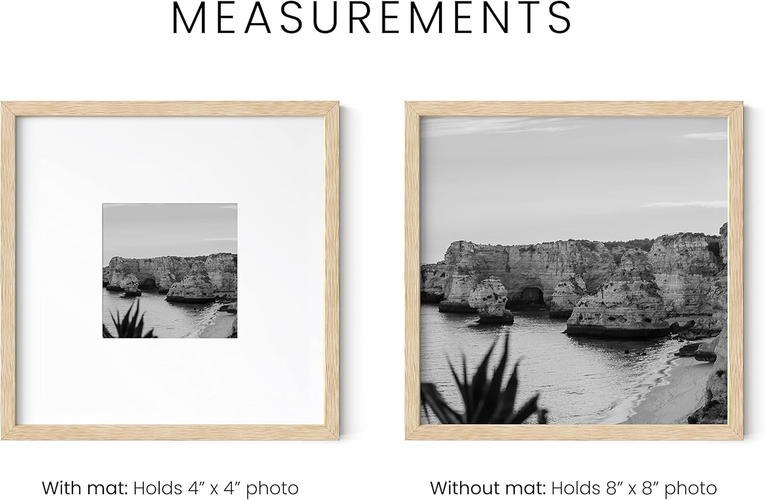 - A THOUGHTFUL GIFT: Our 8x8 picture frames with mat will make an excellent gift for friends and family. Give your loved ones these square poster frames for a birthday, housewarming, graduation, Christmas, or any special occasion. The beige oak wood photo frames and picture frame set will display their favorite memories and add a personal touch to any space