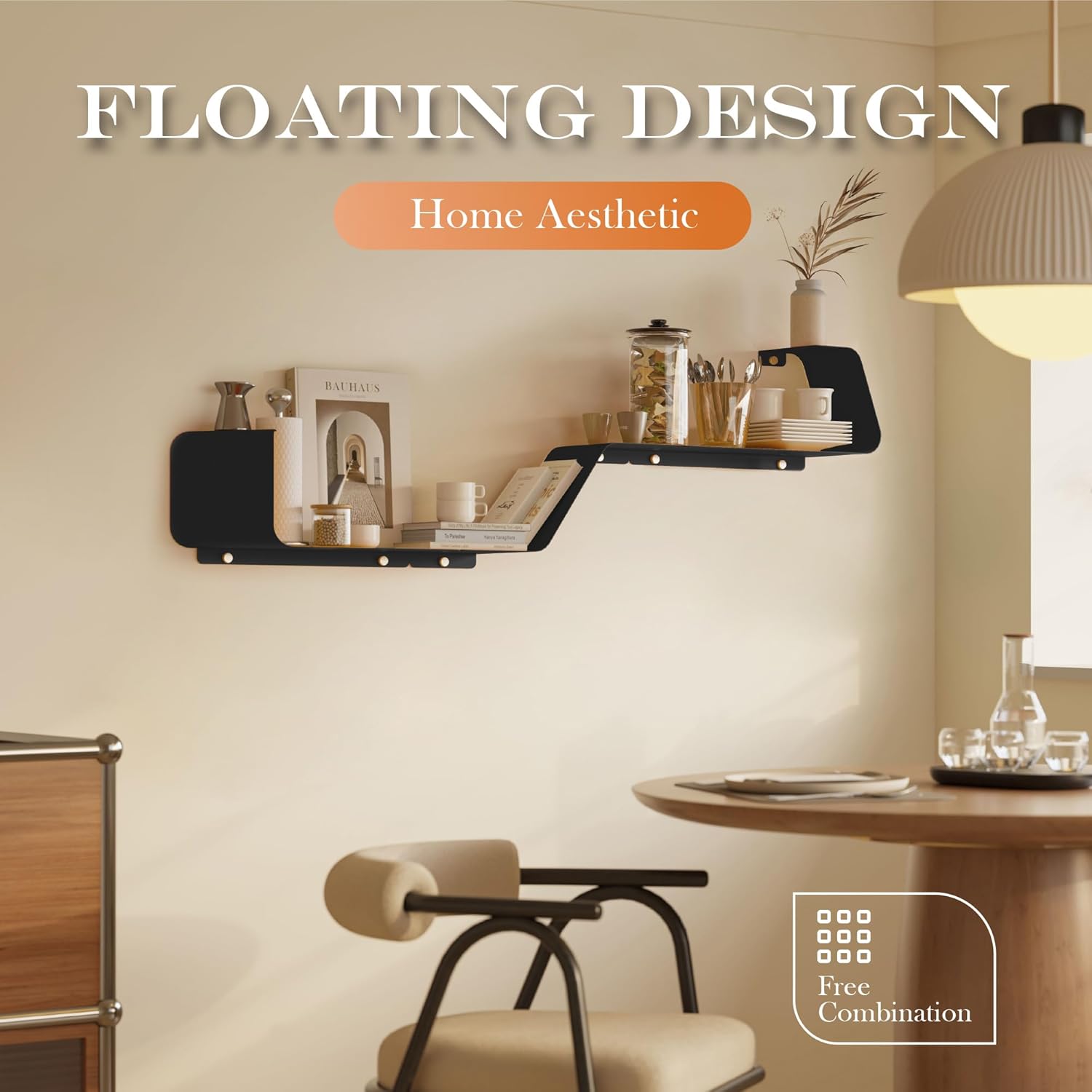 - Multifunctional Floating Shelf: This unique piece offers an inventive design flexible configuration to fit any size of wall space. Transform wasted wall space into a spacious storage area. These shelves, a bedroom showcase for prized items, a living room display for photos, a bathroom organizer for toiletries, or a kitchen rack for spices and so on. It doesn't just offer organization, it elevates your living space, redefining the aesthetic of your home.
