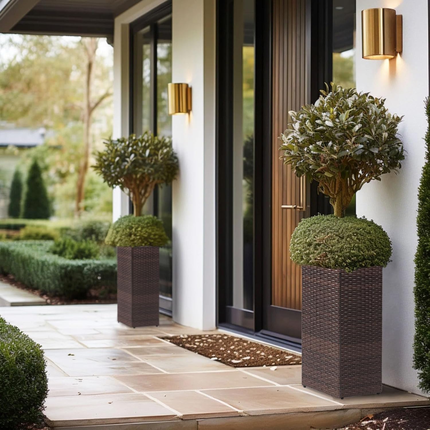 - Durable Planter: The tall square planter is constructed of high-quality metal with all the handwoven charm of PE rattan, making it light-weight yet sturdy and durable. It is rust- and weather-resistant, so you can keep it out in your yard.
