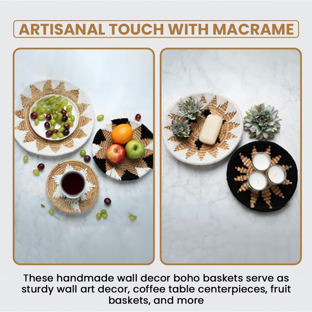 - ๐๐ฎ๐ฌ๐ญ๐๐ข๐ง๐๐๐ฅ๐ ๐๐๐๐ฎ๐ญ๐ฒ: Embrace nature and prioritize sustainability by using natural, eco-friendly and sturdy wicker wall art set. Crafted from 100% natural seagrass wall decor by skilled Vietnamese artisans, Each of our decorative wall baskets is adorned with macrame. Adding a unique, handmade touch to your wicker wall decor. These round wall decor are handmade and carefully woven as wicker wall basket.