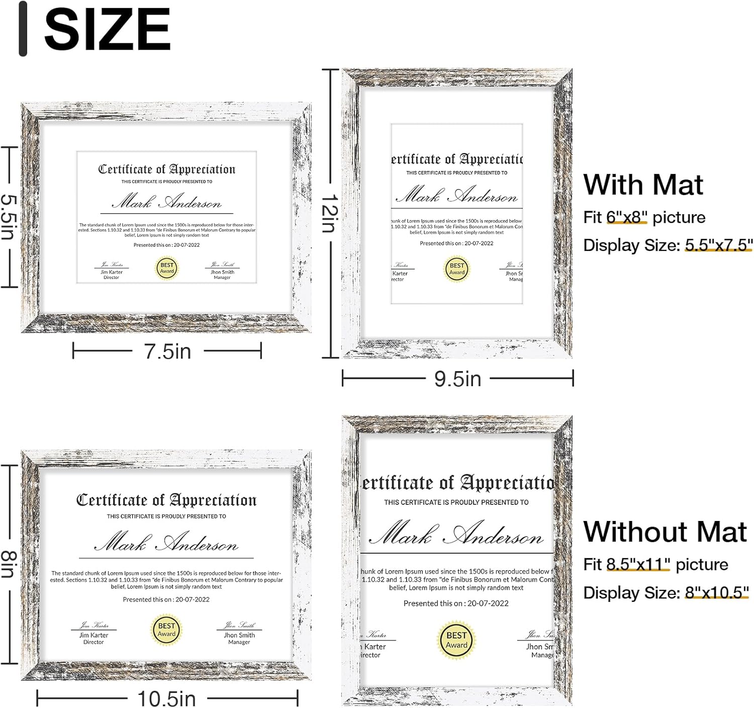 - Size: Each set includes nine 8.5x11 frames with white mats for 6x8 photos, or without the mat for 8.5x11 pictures. The frames are 0.78 inches wide and 0.5 inches thick. The opening of the frame and mat is slightly smaller than the picture itself