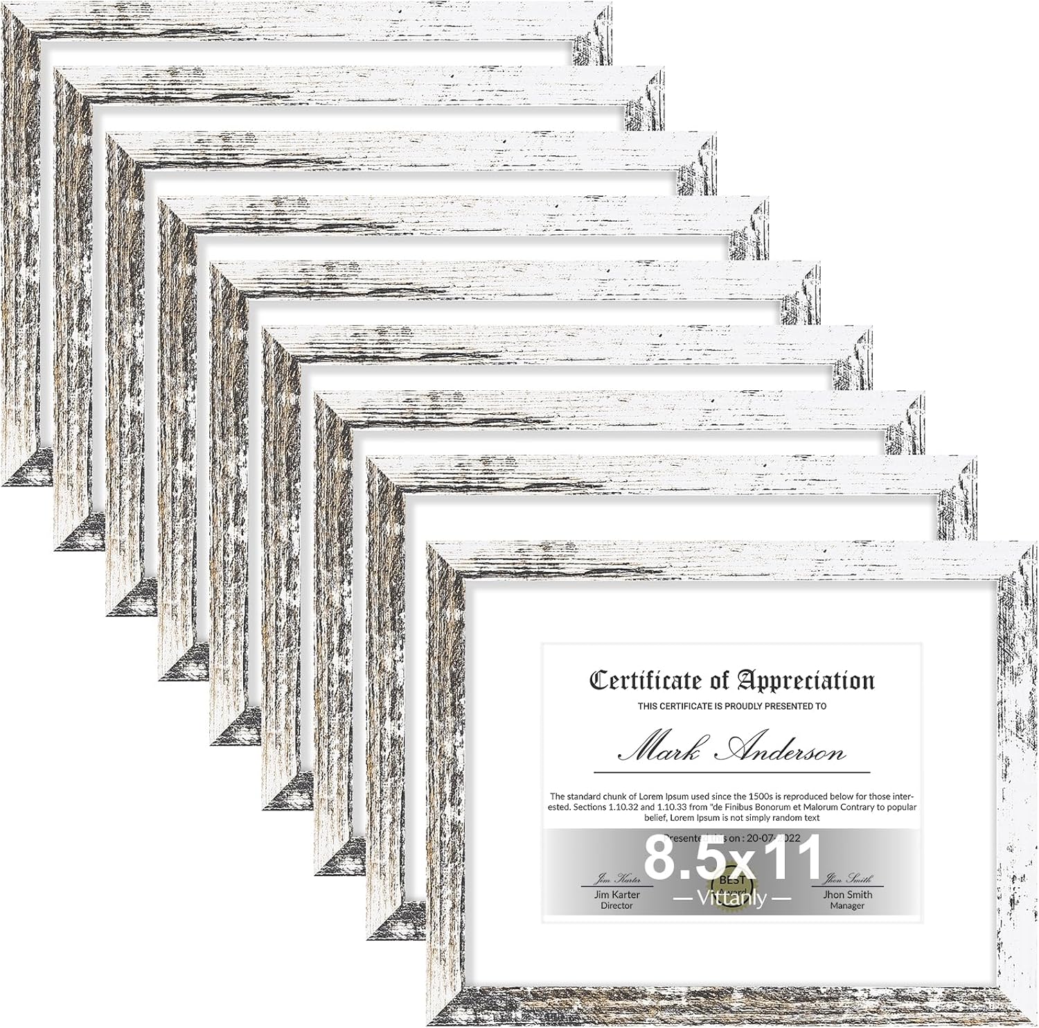 Vittanly 8.5x11 Picture Frames Set of 9, Shatter Resistant Plexiglass, Display 6x8 Pictures with Mat or 8.5x11 without Mat, Photo Frames for Wall or Tabletop, Engineered Wood, Distressed White