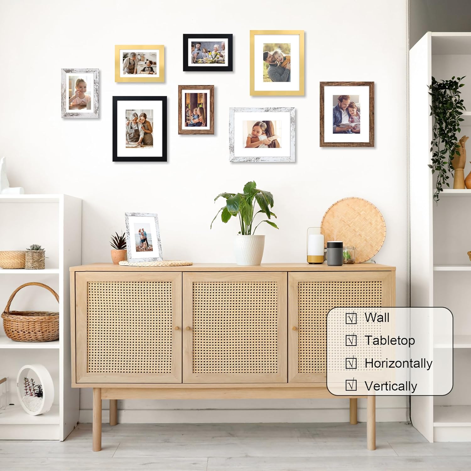 - Multiple Display:8 by 10 photo frames come with hanging hardware, which can be hung horizontally or vertically on the wall, or displayed on the tabletop through the stand