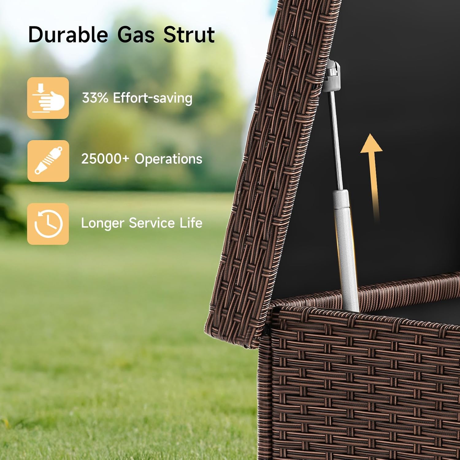 - Enhanced Water Defense: This deck box is designed with each hand-woven rattan component featuring a PP corrugated sheet interior, ensuring items stay dry. The elevated base and reinforced rattan guard against humidity damage, ideal for outdoor cushions and tools storage. Shield your belongings with confidence, knowing they are safe from water-related issues.