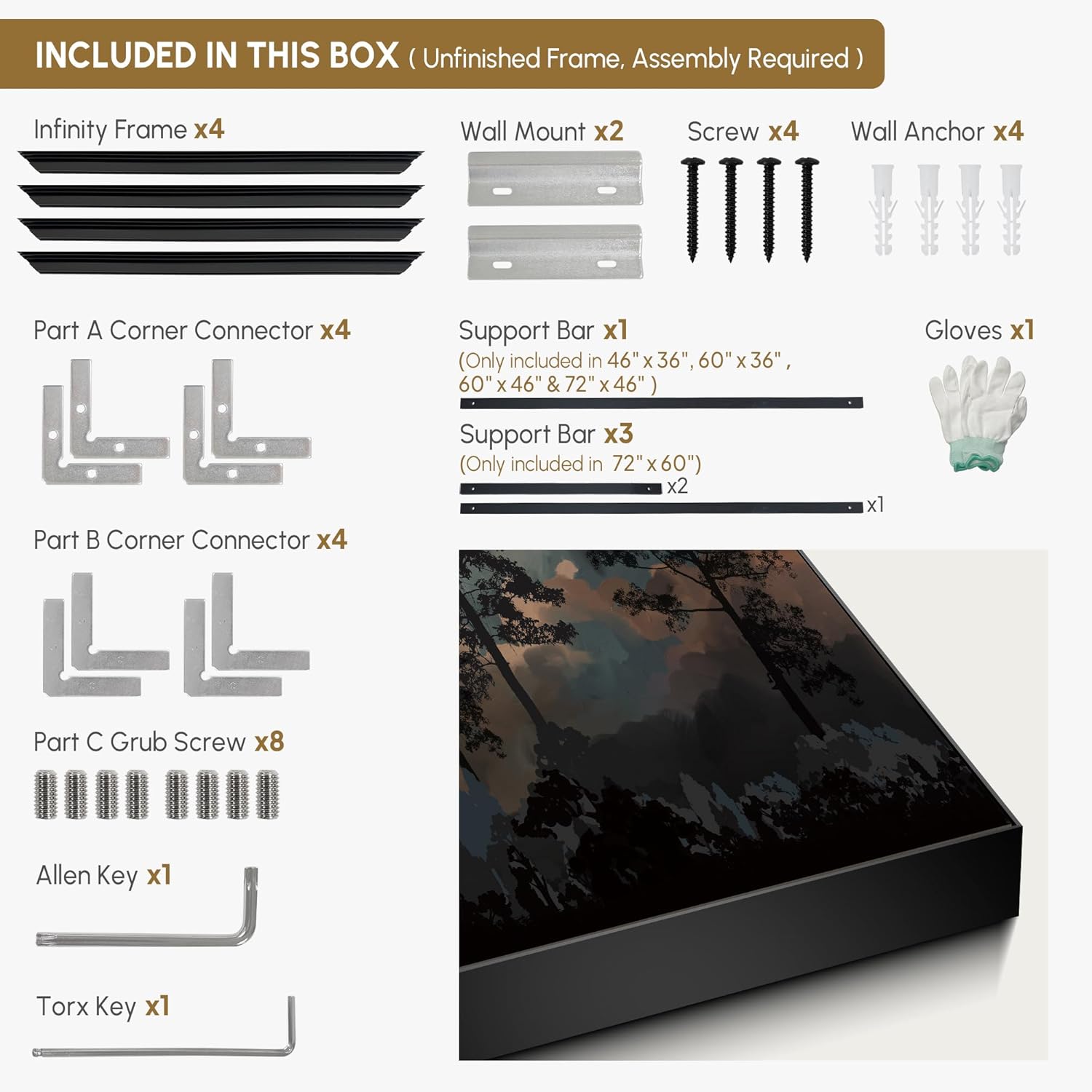 - Assembly Required: The artwork comes with the frame components unassembled. Don’t worry — setup is straightforward and tool-friendly. For best results and accurate alignment, we recommend two people to ensure a smooth assembly and a stable, secure wall mount.